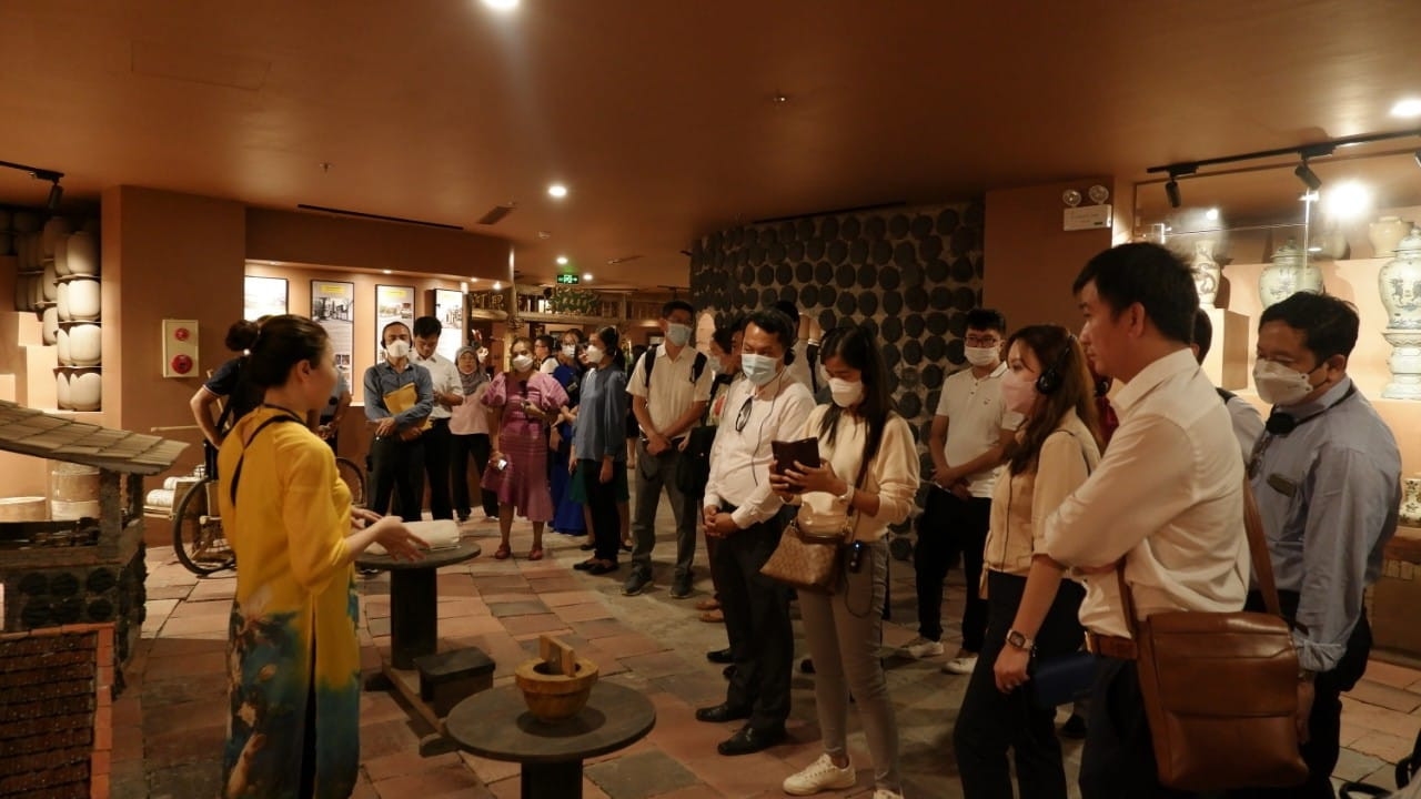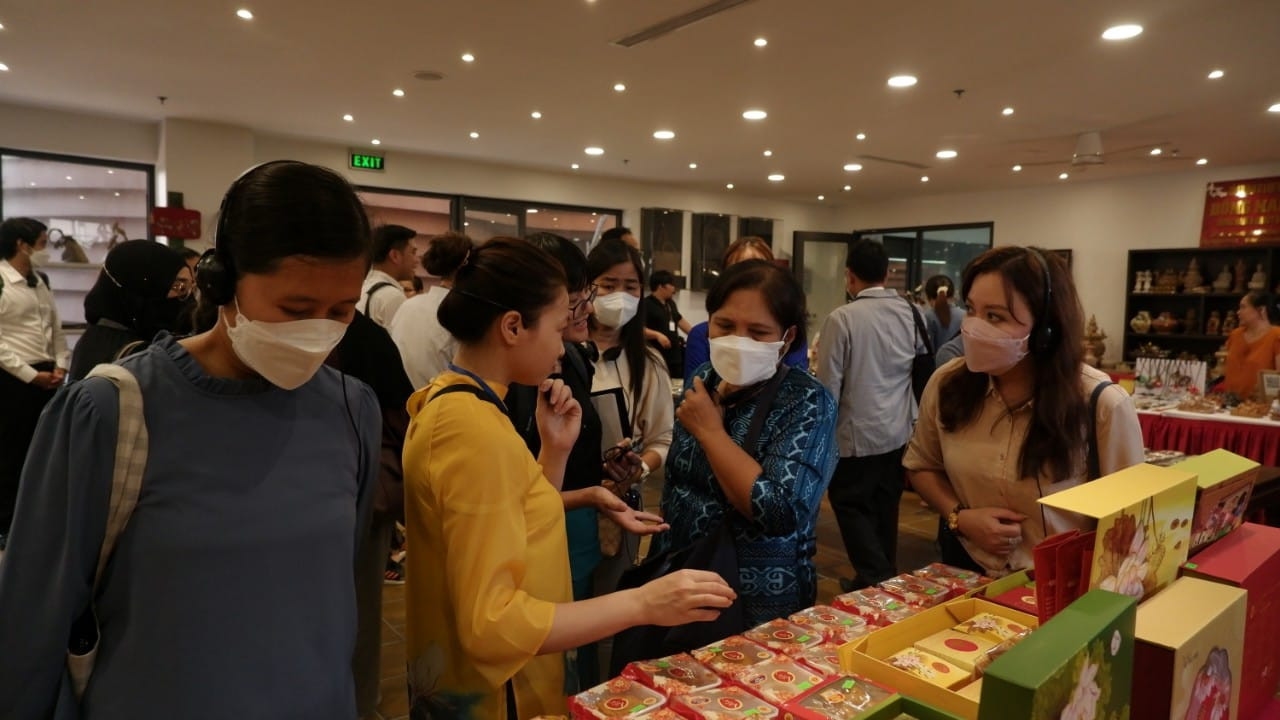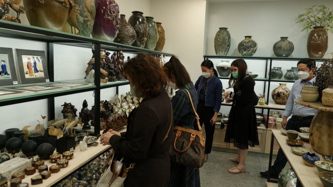 Trong chuyến tham quan, đoàn cũng có cơ hội tìm hiểu thêm về các loại hình sản phẩm OCOP của Việt Nam tại các ki-ot gian hàng trong trung tâm, đồng thời trải nghiệm không gian văn hóa tại Làng gốm cổ truyền Bát Tràng.