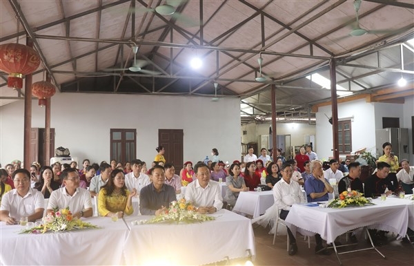 Các đồng chí lãnh đạo huyện, nguyên lãnh đạo huyện Gia Lâm tặng hoa các thanh đồng tham gia diễn xướng