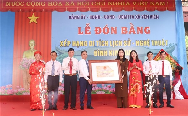 Đồng chí Đặng Thị Huyền- Phó Bí thư Huyện ủy, Chủ tịch UBND huyện trao Bằng xếp hạng di tích lịch sử - nghệ thuật Đình Kim Quan